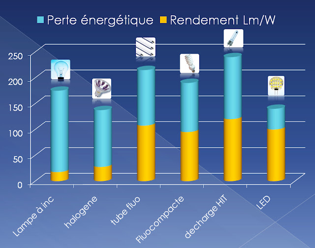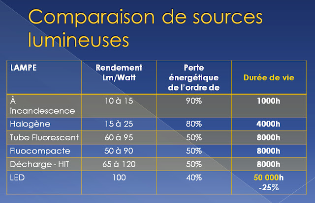 Les lampes à halogène ont un rendement lumineux de seulement 25 lm/W ; 80 % de l’énergie est transformée en chaleur, avec des températures d’exercice élevées ; la durée moyenne de ces ampoules est seulement de 3.000 heures.